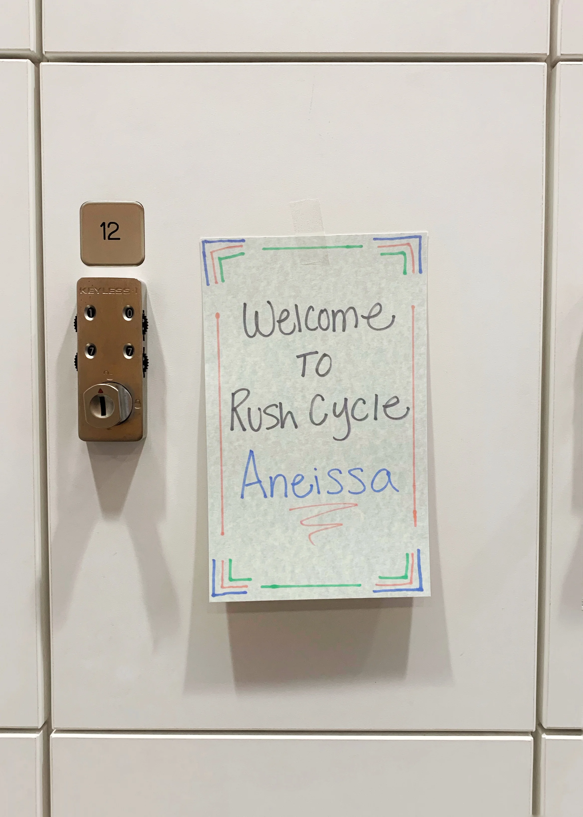 When I arrived at the Rush Cycle facility, still very groggy for apparent reasons, the atmosphere was electric. Clean white colors and bursts of orange accents filled the walls, and the music was bumping. People were interacting as if it wasn't still dark outside; I was mesmerized! So I head to the front desk and unintentionally mumble my name to the Olympic Barbie behind the counter. She was so cheery and excited about my first ride; there was a welcome sign on my little locker! I just thought I was a morning person; these Rush Cycle girls are next level.